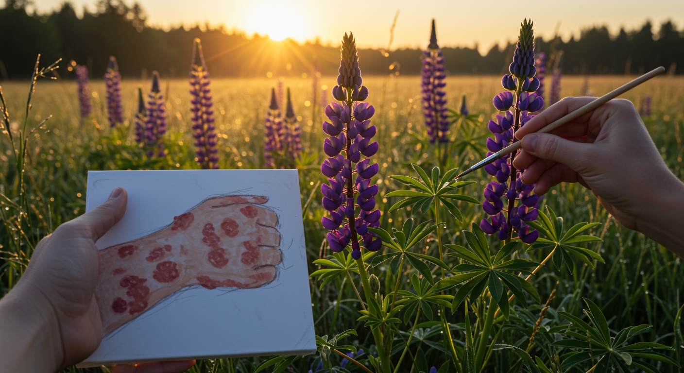 A serene meadow at dawn softly lit by the golden hues of the rising sun, with dewdrops glistening on wildflowers as a gentle reminder of nature's quiet resilience. In the foreground, an artist's hand delicately sketches the early signs of a lupine miracle, capturing the intricate patterns and subtle hues reminiscent of an early lupus rash—nature's artwork on a human canvas—hinting at the fragile beauty and complex symbiosis between health and the environment.