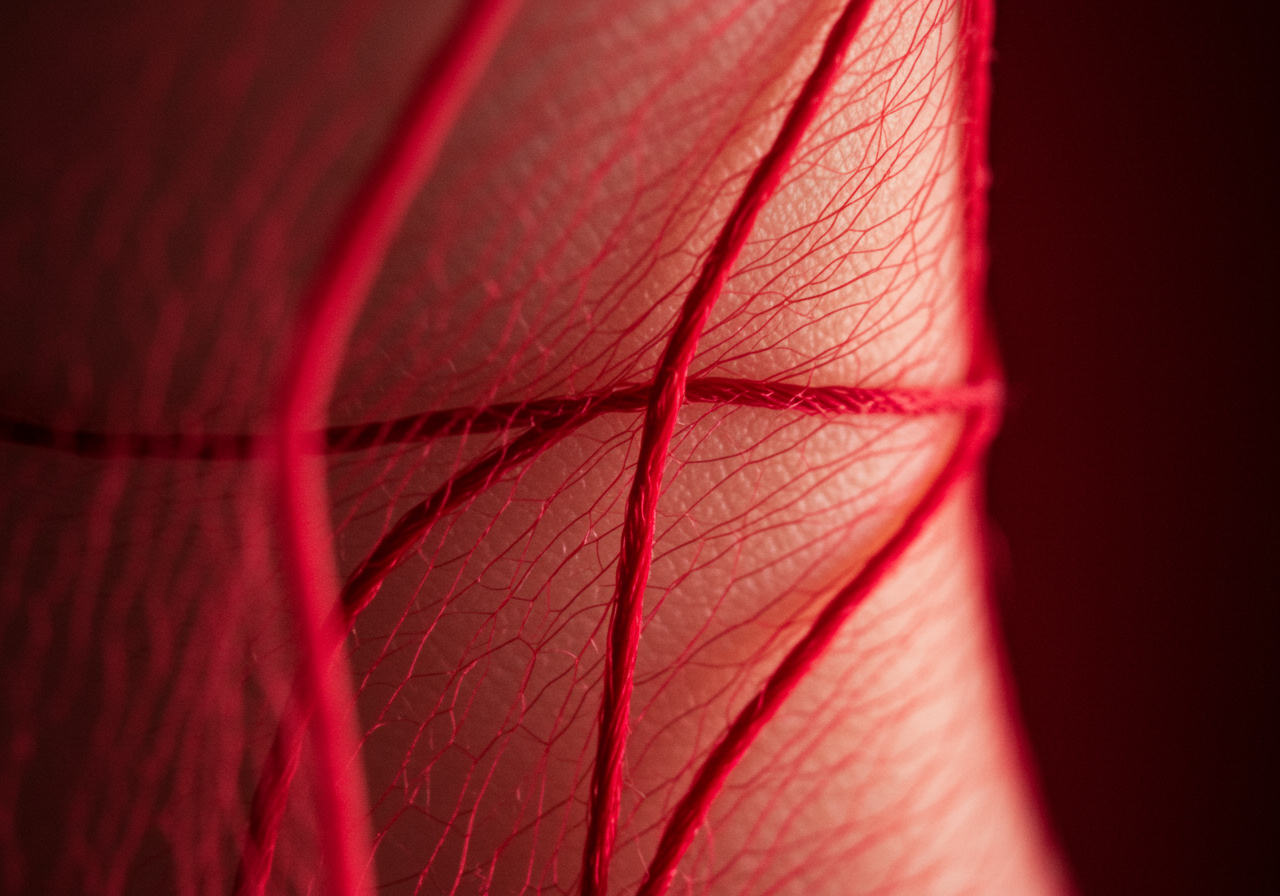 Capture a close-up image that artistically represents the concept of an "early stage blood clot in the foot" by using metaphorical elements; imagine a river of deep crimson threads gently interweaving beneath the delicate translucence of skin-colored fabric, signifying the unseen convergence of life's vivid pathway interrupted by a serene yet poignant disturbance, reflecting the intricate and hidden struggles within the human body.