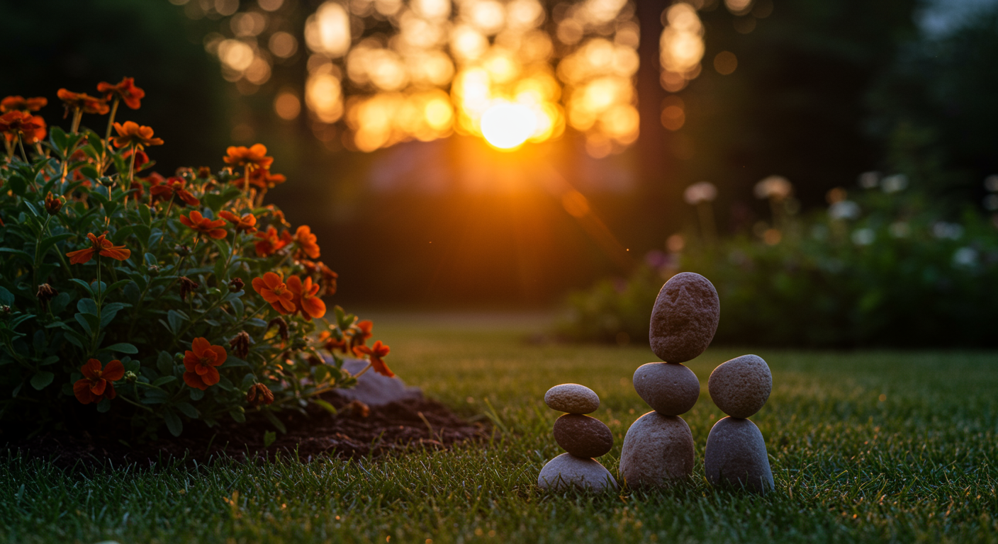 A serene and peaceful garden scene at dusk with the sun setting in the background, casting a warm golden glow on vibrant flowers and lush greenery. In the foreground, a small, artistically arranged rock formation subtly and abstractly resembles the shapes associated with external hemorrhoids, incorporating natural textures and colors to evoke a gentle reminder of the condition within the tranquility and beauty of nature. The overall ambiance is one of harmony and healing, where nature's artistry offers a metaphorical reflection on human health concerns.