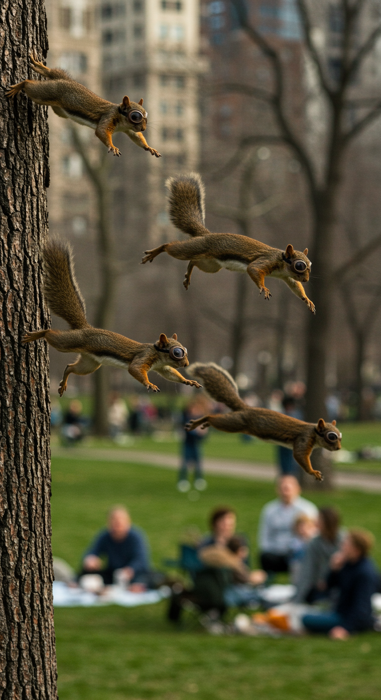A group of mischievous squirrels meticulously planning a synchronized jump from one tree to another, wearing tiny pilot goggles, with a backdrop of a bustling city park filled with unsuspecting picnickers; the squirrels are caught mid-air in an epic, comical moment of flight, each with an expression of sheer determination and hilarity.