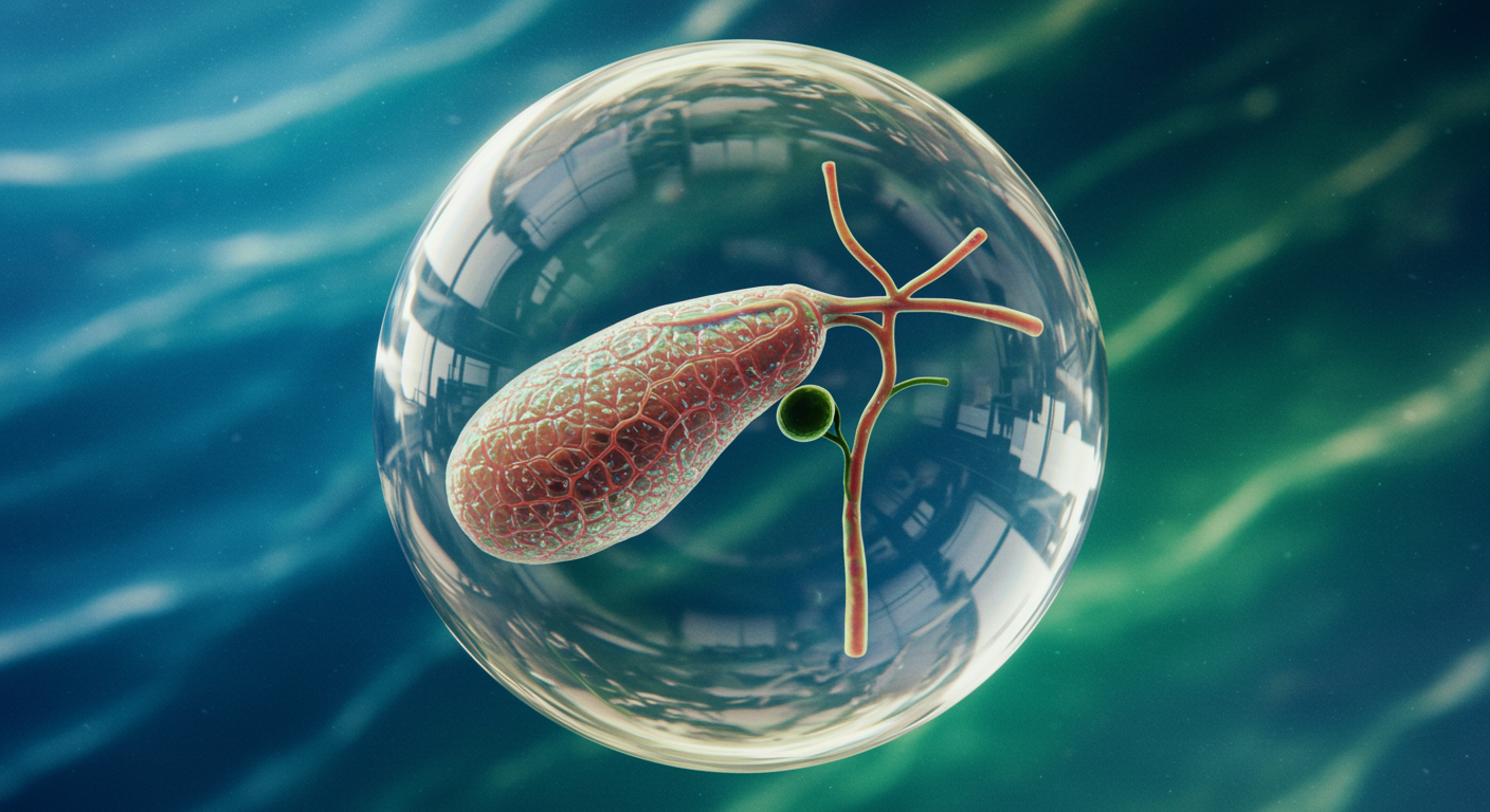 Capture a vivid, hyper-realistic close-up image of a gallbladder suspended in a translucent, glass-like orb, floating in a surreal ocean of swirling blues and greens. The orb's surface gleams with reflections of a medical laboratory, hinting at its origins, while the gallbladder inside appears iridescent, its intricate texture resembling a delicate, otherworldly coral. This striking juxtaposition between the biological and the fantastical invites viewers to contemplate the hidden beauty and complexity within the human body, merging science and art in a single frame.