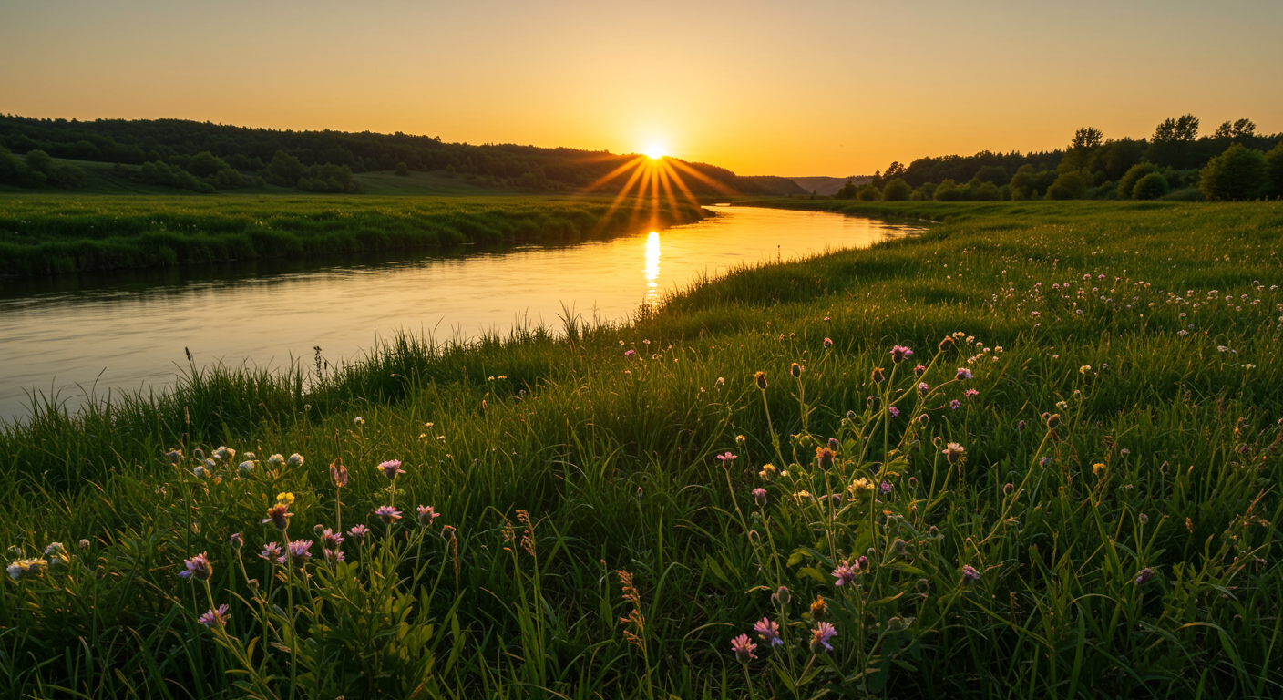 A serene landscape capturing the juxtaposition of nature's beauty and human vulnerability: a tranquil river flowing through a lush green valley under the golden hues of a setting sun, symbolizing the journey of healing and resilience, with delicate wildflowers along the riverbank representing the fleeting yet memorable moments in one's health journey.