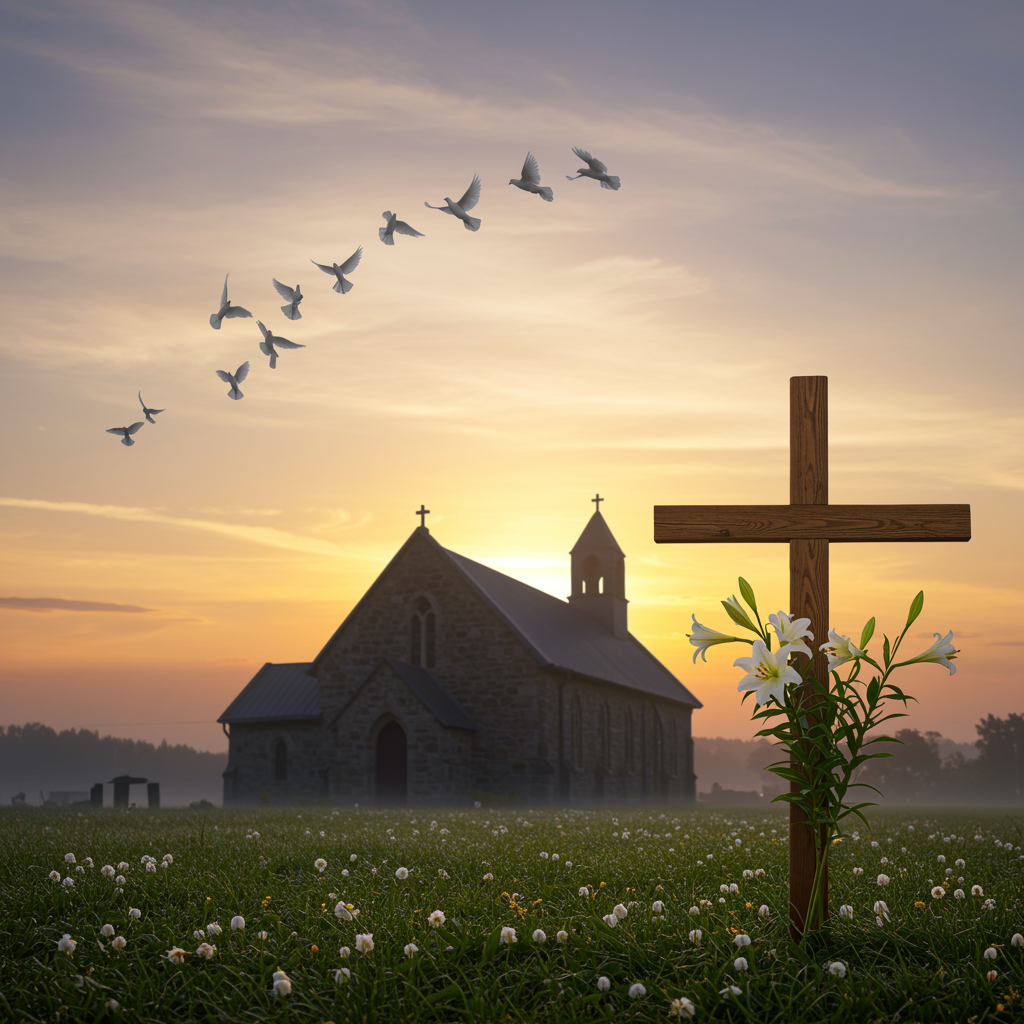 A serene dawn breaks over an ancient stone church, its silhouette bathed in the soft glow of early morning light. A humble wooden cross stands in the foreground, adorned with delicate white lilies, symbolizing purity and hope. In the background, the sky is painted with pastel hues of pink and gold, as a flock of doves ascends gracefully into the heavens, embodying peace and renewal. The scene is tranquil and contemplative, capturing the essence of Good Friday, a day of solemn reflection and reverence.