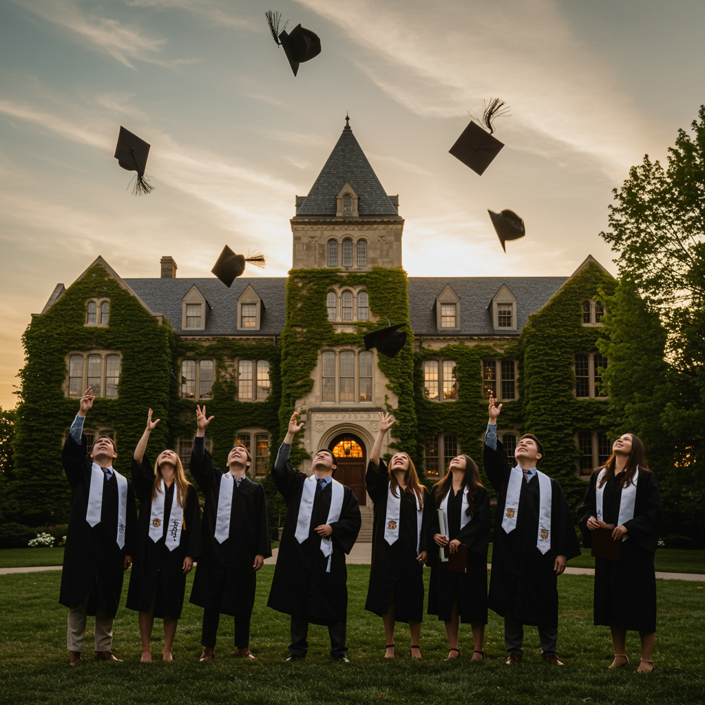 Capture the essence of academic achievement and the dawn of new beginnings with a sunlit scene of jubilant graduates in their caps and gowns, tossing their hats into a sky aglow with the vibrant hues of sunset, their silhouettes framed against the grand backdrop of an ivy-clad university building, as laughter and joy echo in the golden hour light, immortalizing the euphoric moment of transition from students to young professionals with dreams as vast as the horizon before them.