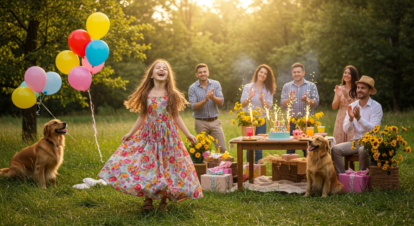 A sun-drenched meadow where a young girl, wearing a vibrant, flowing dress adorned with flowers, joyfully dances amidst a whirlwind of colorful balloons. Her laughter echoes through the air, harmonizing with the gentle rustle of leaves. Nearby, a rustic wooden table is tastefully decorated with a whimsical birthday cake, topped with sparklers that burst like fireworks in miniature celebration. In the background, friends and family, sharing in her happiness, clap along, while a golden retriever joins the fun by playfully chasing the balloons. Sunlight filters through the trees, casting dappled patterns on this heartwarming birthday scene, a celebration of life's precious moments.