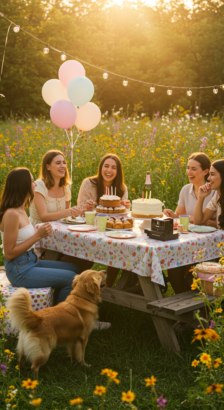 A radiant sunlit garden bursting with vibrant wildflowers of every shade, a wooden picnic table adorned with colorful, whimsical patterned tablecloths, where an assortment of homemade cakes and pastries tempt taste buds; cheerful balloons in pastel colors dance lazily in the gentle breeze. Friends gather around the table, serenading the guest of honor with joyful laughter and heartfelt toasts, while a golden retriever playfully weaves through their legs, tail wagging. A vintage Polaroid camera captures candid moments, preserving smiles and shared glances beneath a canopy of twinkling fairy lights that suggest it's a magical, unforgettable birthday celebration.