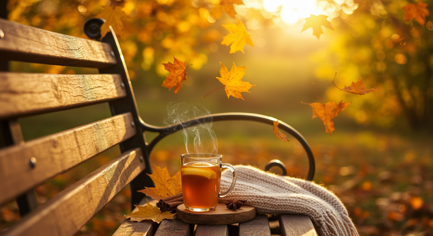 A scenic photo capturing the essence of autumn as the golden sun filters through a canopy of vibrant maple leaves, creating a dappled light effect on a rustic wooden bench. Nearby, a cup of steaming apple cider rests on the arm of the bench, casting a small spiral of steam upwards. In the background, a gentle breeze sends leaves cascading down, as a cozy woolen scarf drapes over one side of the bench, inviting viewers to sit and say hello to fall's warm embrace.