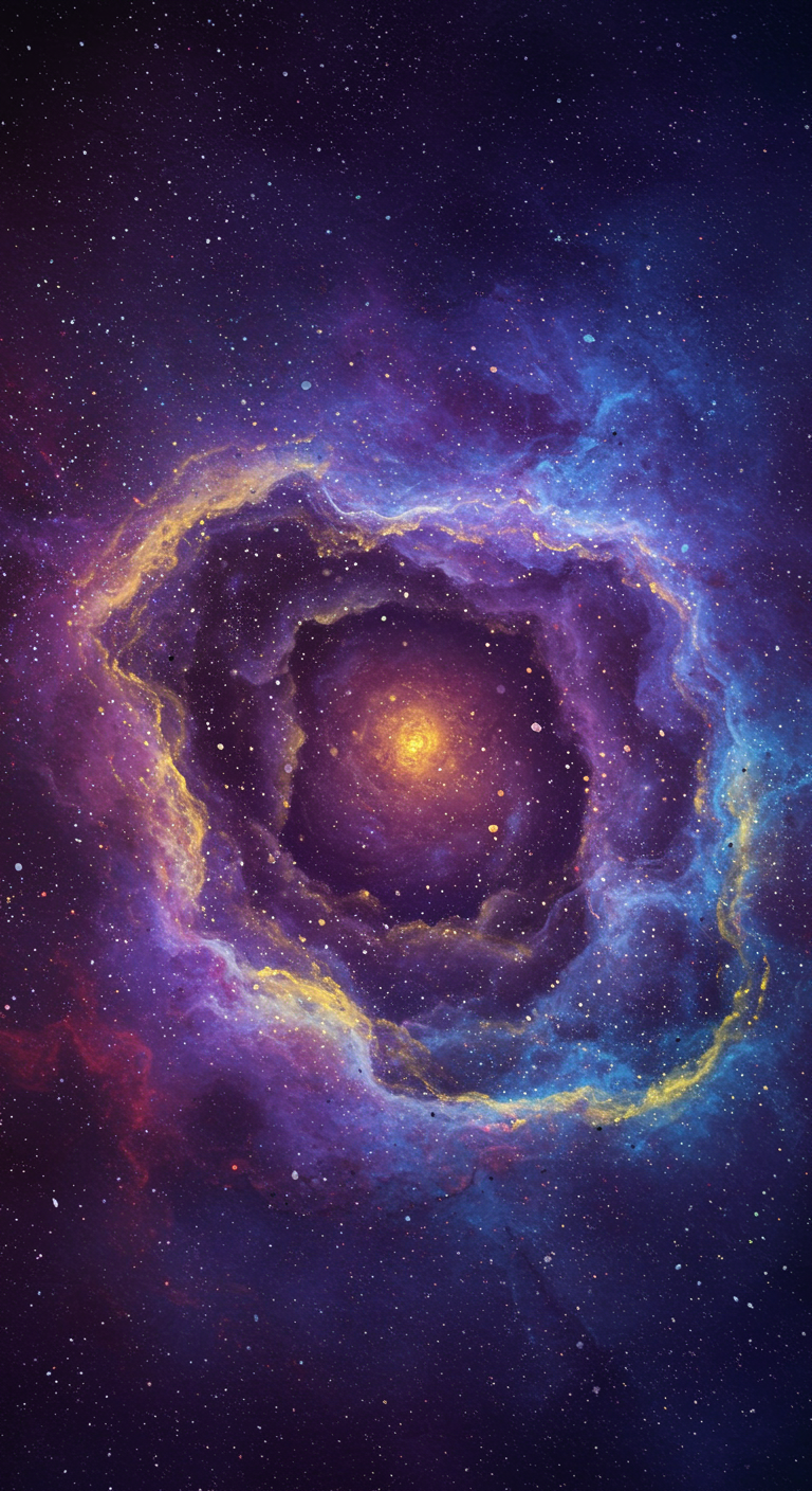 Capture a vivid and artistic representation of a hematoma as a swirling universe beneath the skin, with deep purples, blues, and traces of yellow resembling nebulous clouds against a starry backdrop, illustrating the body’s natural response to an injury while abstractly portraying the beauty and complexity of healing.