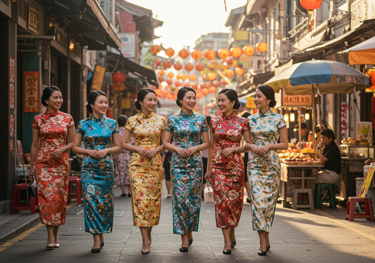 A vibrant street scene during the bustling Lunar New Year festival in a colorful Asian city, with elegantly dressed women in traditional silk cheongsams, their intricate patterns and vibrant hues catching the eye. The women, of various ages, share laughter and stories as they stroll past lantern-draped storefronts and vendors selling an array of fragrant street food. Their radiant confidence and graceful movements mirror the vibrant energy of the celebration, embodying a timeless blend of culture and modernity. The sunlight casts a warm glow, enhancing the vivid colors and the overall joyous atmosphere.