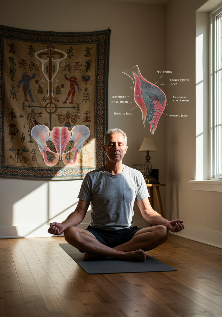 A serene scene unfolds in a sunlit room where a middle-aged man sits cross-legged on a yoga mat, deep in focused concentration. Around him, flowing diagrams appear suspended in the air, illustrating the intricate network of pelvic muscles. A tapestry depicting ancient symbols of strength and balance hangs on the wall, evoking a sense of timeless wisdom. Light filters through a nearby window, casting a gentle glow over a peaceful face, as he embarks on a journey of inner resilience, the image capturing the convergence of modern practice and ancient knowledge in a moment of personal empowerment.