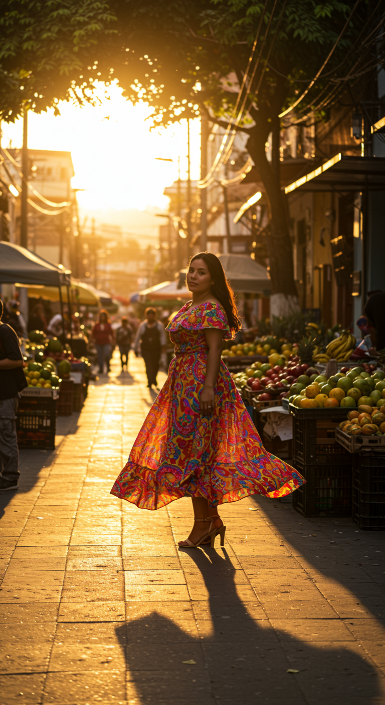 A sun-drenched street market in a vibrant Latin American city, bustling with colorful stalls filled with exotic fruits, spices, and handmade crafts; in the foreground, a confident Latina woman in a bright, flowing dress turns slightly, her silhouette capturing the energy and grace of her culture, as the golden light of the late afternoon highlights her form amidst the lively scene, symbolizing the celebration of diversity and the beauty of everyday life.