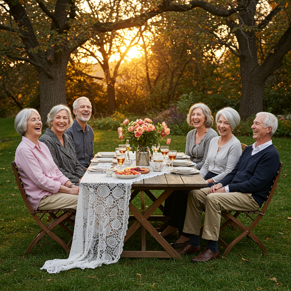 An autumn afternoon in an elegant, cozy garden with a long wooden table set for an intimate gathering; it is adorned with vintage lace tablecloths, mismatched china, and bouquets of fragrant late-blooming roses gathered in rustic vases. In the background, the golden sunlight filters through the leaves of ancient oak trees, casting intricate patterns on the lush grass. The scene is completed by a group of mature friends, joyfully laughing and sharing stories, each with a unique, well-lived face that tells its own tale, creating a tableau that captures the essence of wisdom and enduring friendship.