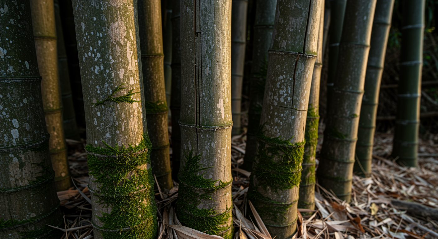 A serene and timeless image capturing the intricate beauty of nature's aging process: a cluster of mature bamboo tubes standing tall against the soft glow of a setting sun, each tube showcasing delicate moss-covered textures and gentle cracks from years of weathering, surrounded by a lush carpet of fallen leaves, creating a harmonious blend of life, decay, and renewal.