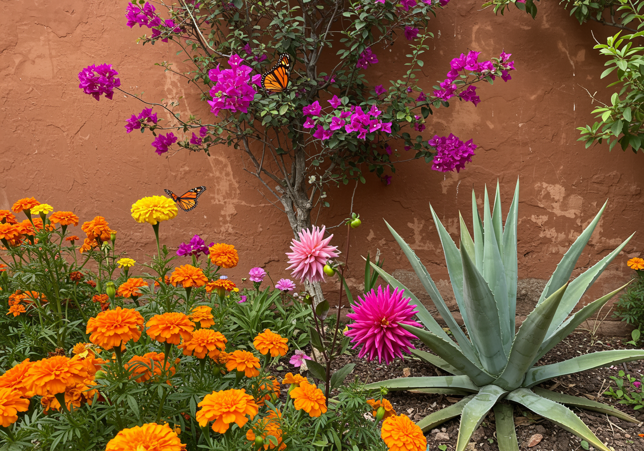 A vibrant burst of life captured in a sun-drenched Mexican garden, where an array of colorful flowers dances in the gentle breeze. Bright marigolds, vivid bougainvillea, and striking dahlias create a tapestry of warm, bold hues against a backdrop of rustic terracotta walls. A delicate monarch butterfly flutters above, casting a playful shadow on a nearby agave, while the soft notes of a distant guitar weave through the air, embodying the joyful spirit of a festive Mexican afternoon.