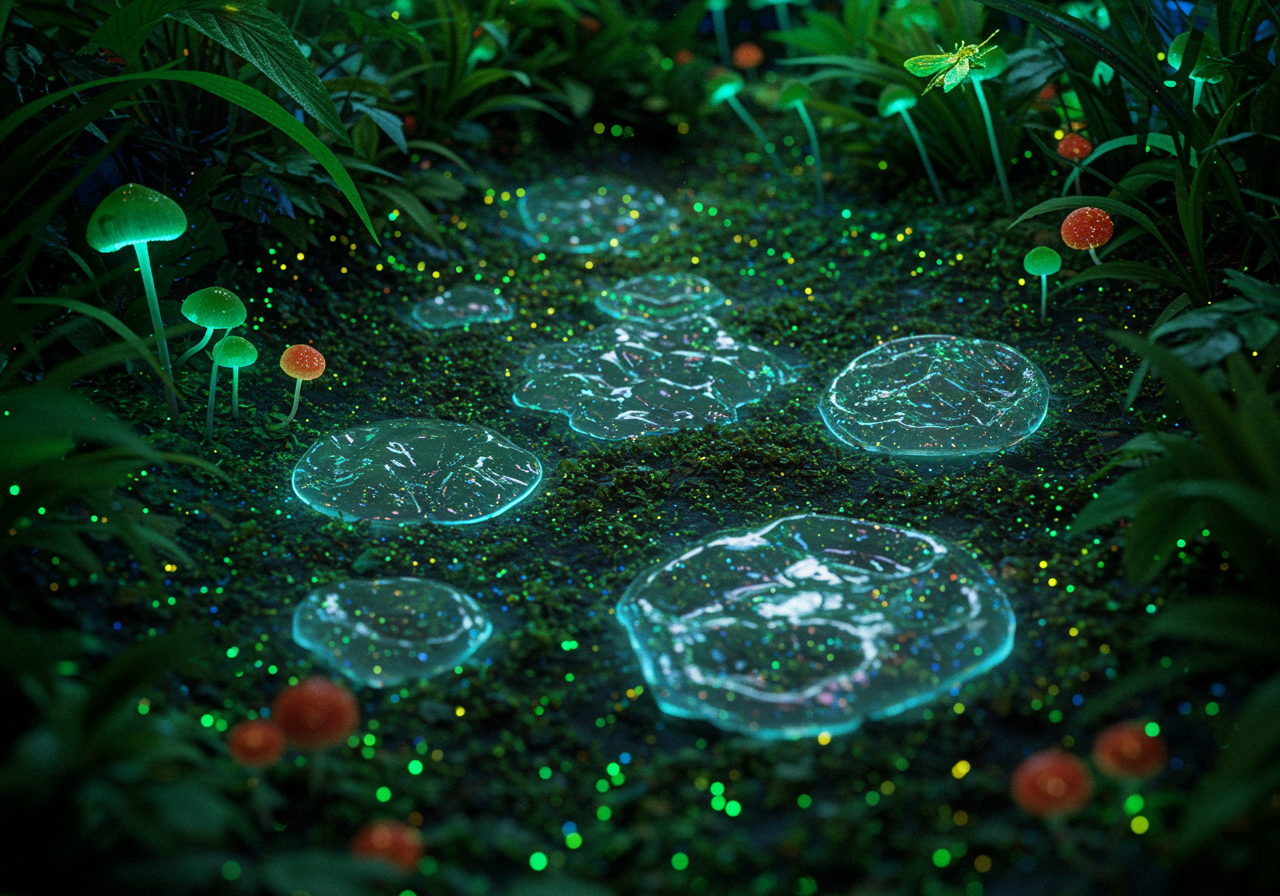 Capture the surreal depiction of a vibrant rainforest floor where mystical bioluminescent fungi and iridescent insects create an otherworldly glow. Amidst this luminous undergrowth, an unexpected and whimsical feature appears: softly shimmering, translucent pools of natural resin mimicking the intriguing texture and organic patterns of mucus. These ethereal formations blend seamlessly with the lush foliage, illustrating an imaginative harmony between the mystique of nature and its fascinating, often overlooked details. The scene captures a microcosm of life, symbolizing renewal and the hidden beauty within biological processes.