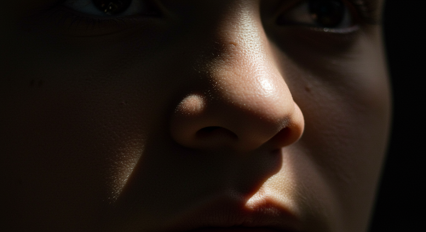 An ethereal close-up captures the raw emotion of a serene face, enveloped in soft shadows and warm light, where the intricate details of the nostrils tell an untold story of human vulnerability and resilience, embodying the delicate beauty and enigmatic depth of nasal vestibulitis.