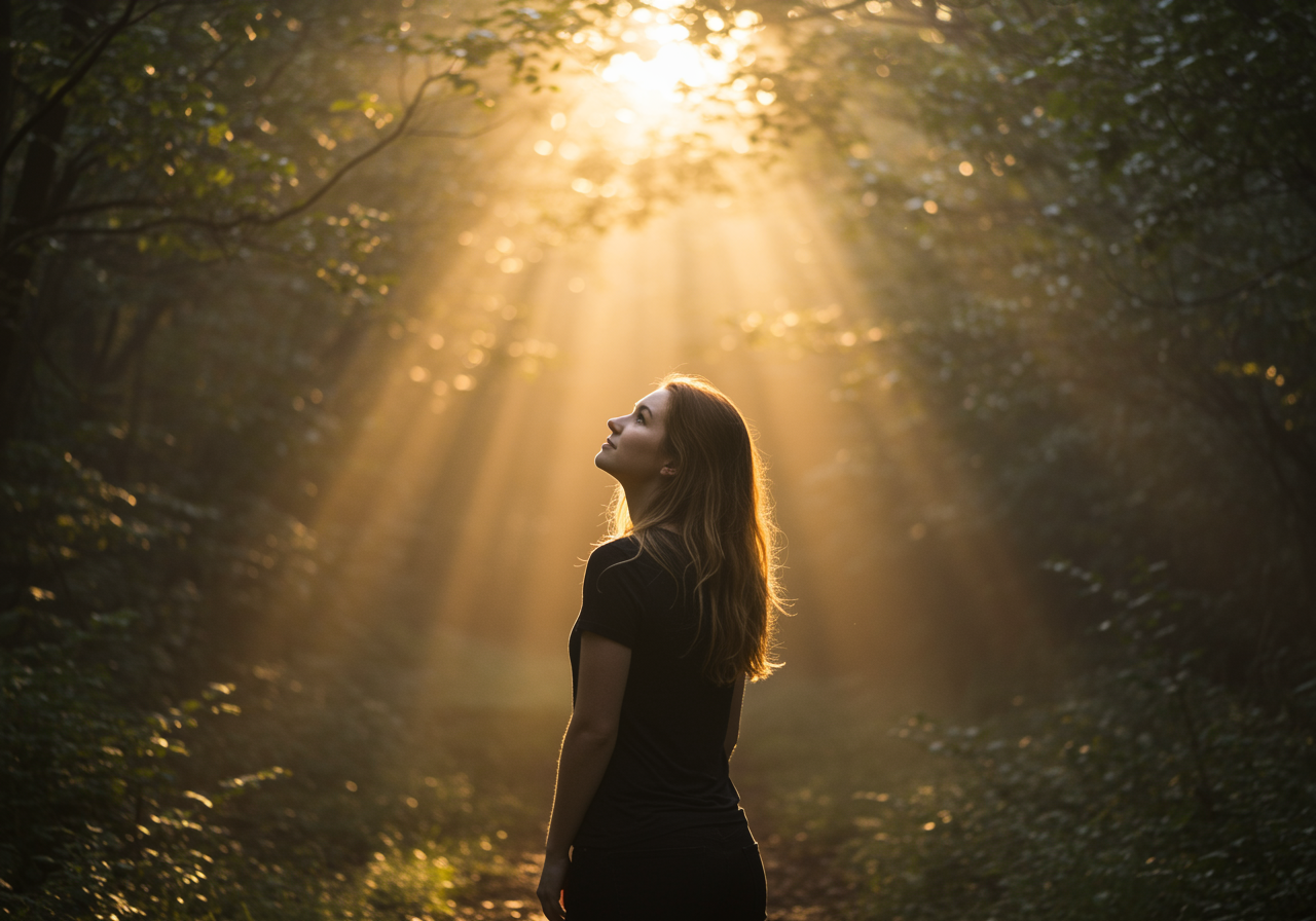 A misty, enchanting forest at dawn, where sunlight filters through the dense canopy, casting a golden glow on a hidden clearing. In the heart of this magical setting, a young woman named Natalie Reynolds stands with her back to the camera, gazing up into the light with a serene expression. She is partially obscured by the mist, creating an ethereal, dreamlike quality. Her hair catches the morning light, creating an aura around her. This image captures a fleeting moment of tranquility and mystery, inviting viewers to consider the untold stories hidden within the world.