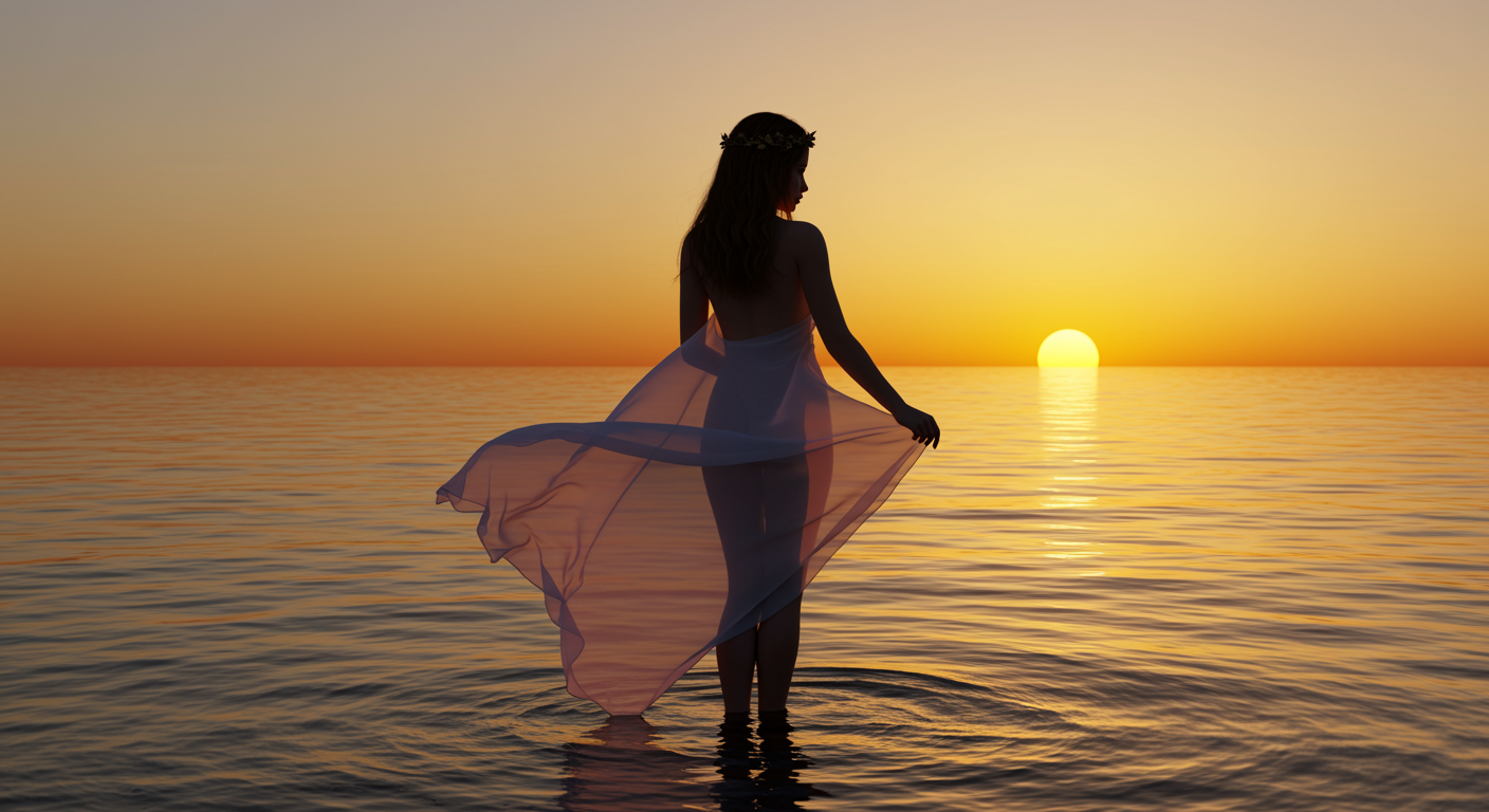 "Envision a serene beach at sunset, where the warm, golden hues melt into a calm, azure sea. A young woman, reminiscent of Greek mythology, stands at the water's edge. Her silhouette is elegantly draped in flowing, translucent fabric that dances with the breeze, hinting at the human form beneath yet leaving much to the imagination. The scene captures a private moment of introspection and natural beauty, where the ethereal quality of the environment mirrors the delicate essence of her presence, evoking a sense of timeless elegance and peaceful solitude."