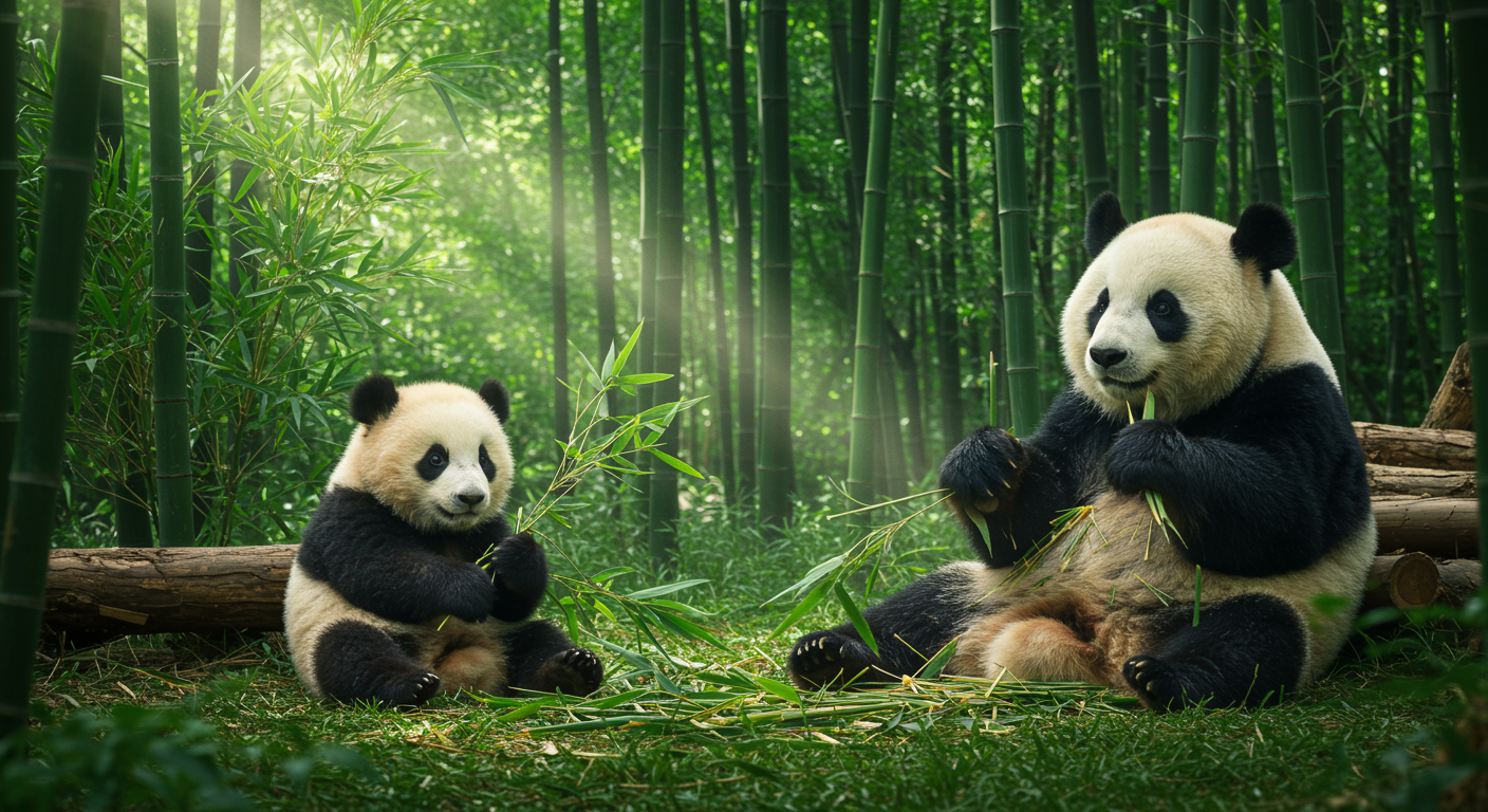 Capture a serene and whimsical moment in the vibrant bamboo forest, where a playful panda cub is sitting among delicate shafts of sunlight filtering through the lush canopy, its soft black and white fur contrasting beautifully with the rich greens around; nearby, an elder panda leisurely munches on bamboo shoots, creating a heartwarming scene that embodies the gentle essence of nature’s wonder and the enduring bonds of family.
