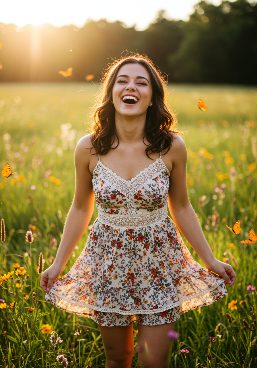In a lush, sunlit meadow surrounded by wildflowers in vibrant bloom, a confident young woman exudes an air of playful elegance as she embraces the gentle warmth of the afternoon sun. Her floral summer dress, adorned with intricate lace details, sways softly in the breeze, subtly enhancing her graceful silhouette. Her joyful laughter echoes across the field, capturing the essence of youthful exuberance and self-assured poise, as butterflies dance around her in harmonious delight.