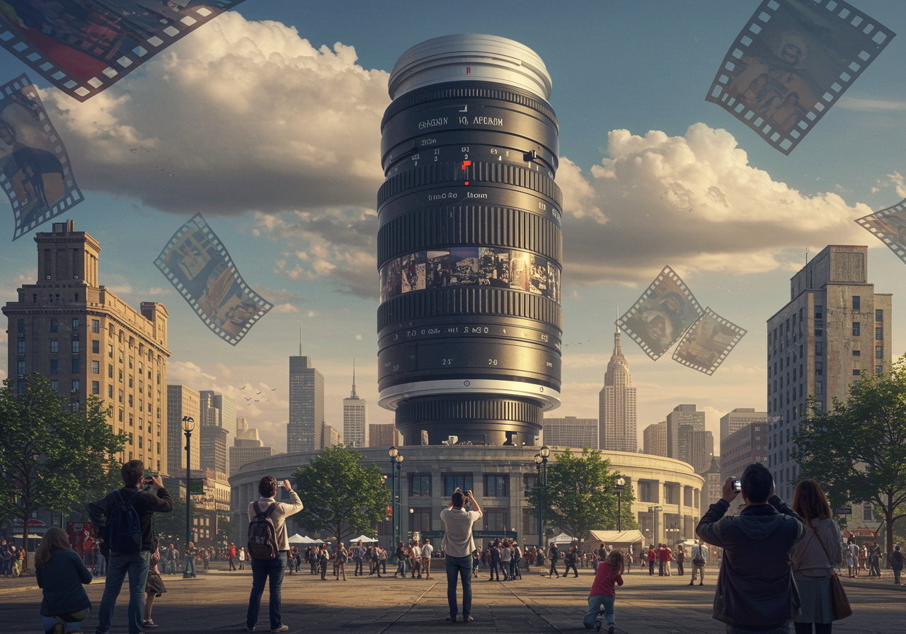 A surreal cityscape where giant, translucent film negatives float through the sky like clouds, casting vibrant, multicolored shadows over the bustling streets below. In the center, a massive camera lens rises from the earth like a modern monolith, its glass reflecting a kaleidoscope of past and present moments from the city, embodying the essence of a "photos icon." The scene is alive with the movement of people capturing their own stories, each snap of their cameras creating a ripple effect in the atmosphere, distorting the surrounding architecture briefly before everything settles into a harmonious blend of nostalgia and innovation.