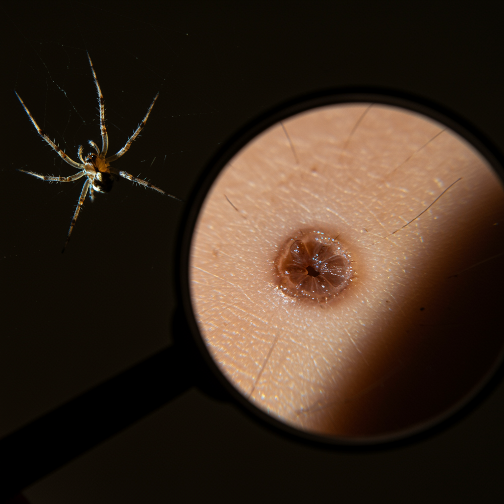 Capture the intricate detail of a house spider bite beneath a magnifying glass, highlighting the subtle textures of the skin and the delicate fang marks. Surround the bite with soft, dramatic lighting that casts gentle shadows and emphasizes the contrast between the human and insect world. Include a faint silhouette of a house spider in the background, slightly out of focus, to evoke a sense of mystery and curiosity about the tiny creatures that dwell within our homes. The overall mood should be one of intrigue and the hidden stories entwined in everyday life.
