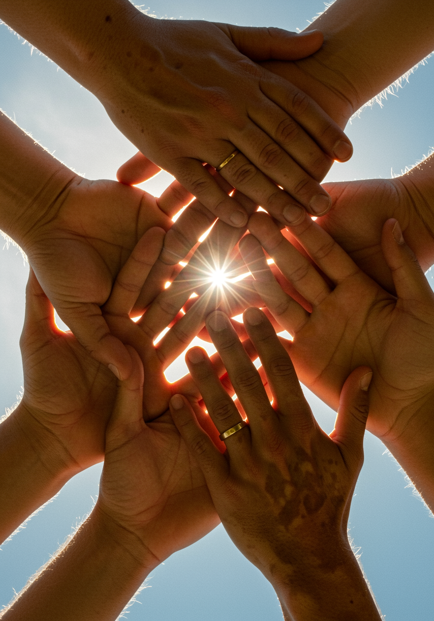 Capture the intricate beauty in diversity through a close-up photograph of a diverse group of hands intertwined, each showcasing the unique patterns of mottled skin. The natural light filters through the spaces between the fingers, casting delicate shadows and highlighting the varying textures and tones. The image serves as a powerful reminder of the individuality and shared humanity within a moment of unity and connection.