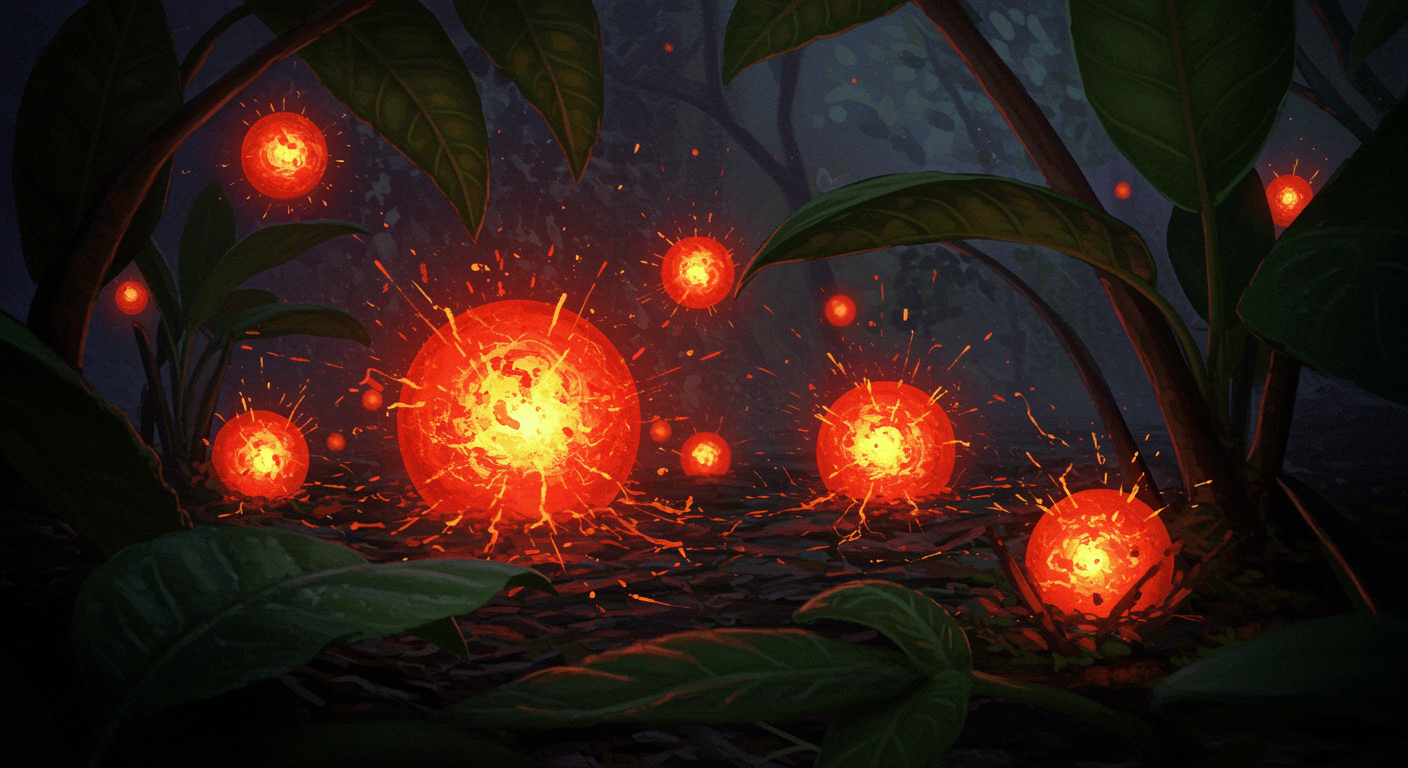 A surrealistic portrayal capturing the inner turmoil of a secluded garden hidden beneath soft, protective leaves, where vibrant, luminescent orbs pulsate with the intensity of volcanic suns, each representing the unseen whispers of nature’s delicate, yet powerful eruptions, inviting a contemplative exploration of beauty and pain in the most private corners of existence.