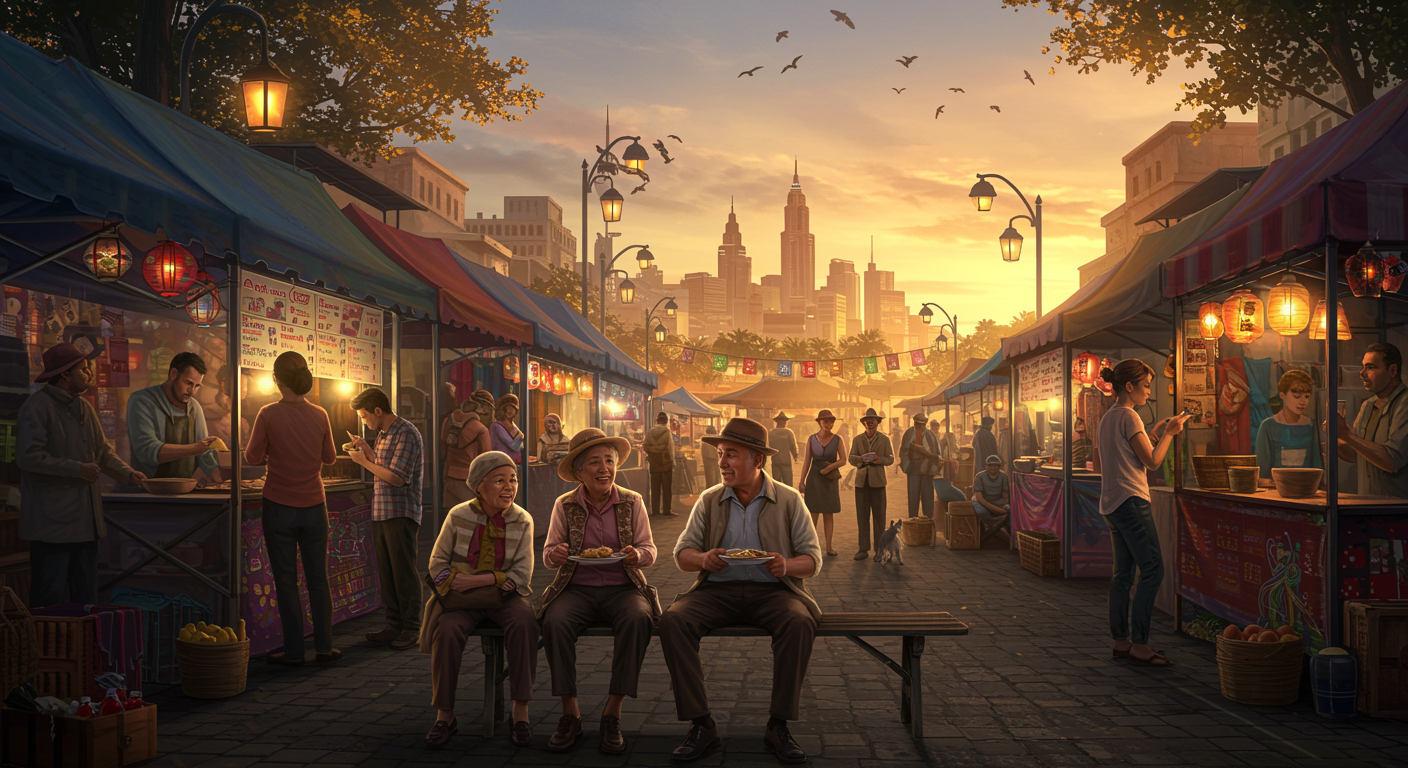 A bustling street market scene at sunset, filled with vibrant stalls draped in colorful fabrics and illuminated by strings of hanging lanterns; diverse groups of people mingle, barter, and laugh, with a family sharing a meal at a food stand, a pair of elderly friends exchanging stories while seated on a bench, and a young couple capturing the moment with an old-school camera, all set against the backdrop of a magnificent city skyline bathed in warm golden light.
