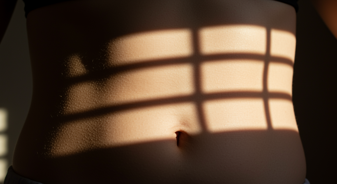 "Capture a serene, abstract representation of healing: a close-up shot of a gentle embrace between sunlight and the delicate skin of a human abdomen, tracing the faint, graceful lines of a post-hysterectomy journey. The image should evoke a sense of resilience and rebirth, with soft hues of dawn breaking through a window casting ethereal shadows, symbolizing the strength and beauty of recovery."