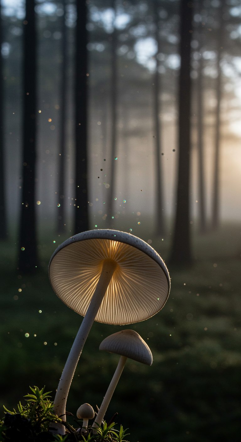 In a misty forest at dawn, a macro shot captures psilocybin spores gently releasing from the gills of a luminescent mushroom, their delicate patterns visible in the soft morning light, with a background of towering trees and a faint rainbow filtering through the fog, evoking a sense of wonder and the mysteries of nature's hidden realms.