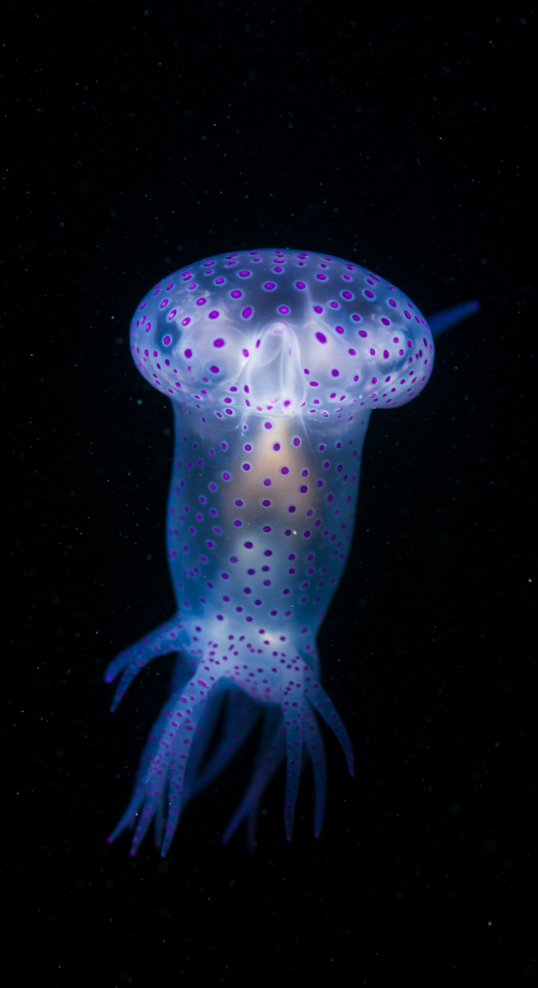 Capture a stunning close-up image of a mysterious, ethereal sea creature gliding gracefully through the deep ocean, its translucent skin dotted with iridescent purple spots that shimmer like constellations against the dark, inky waters. The play of light and shadow highlights the delicate textures and vibrant hues, creating a mesmerizing visual symphony that evokes both wonder and curiosity about the enigmatic life hidden beneath the waves.