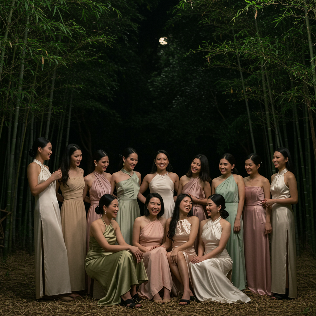 A serene evening in a lush, moonlit bamboo forest where a group of graceful, confident Asian women dressed in elegant, flowing silk gowns share a moment of laughter and camaraderie, their beauty shining naturally under the soft, dappled light filtering through the leaves, capturing an essence of timeless allure and charm.