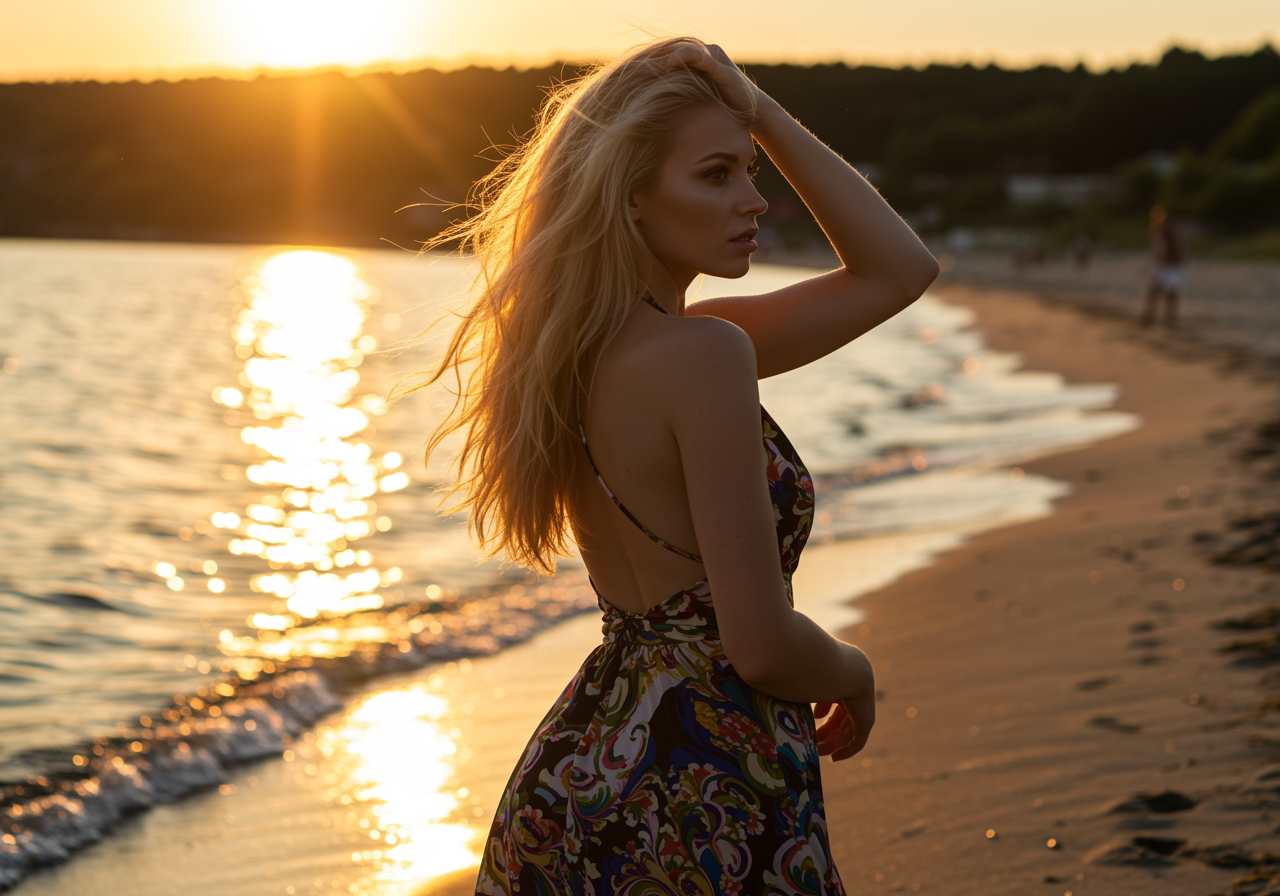In the golden light of a summer sunset, a confident and sophisticated blonde woman stands effortlessly poised on a windswept beach. Her hair cascades in shimmering waves, mirroring the vibrant hues of the setting sun. Dressed in elegant, flowing attire that flutters with the gentle ocean breeze, she gazes out at the horizon, embodying a captivating blend of allure and timeless elegance. The serene landscape around her is painted with warm colors, enhancing the scene's harmonious blend of natural beauty and magnetic charm.