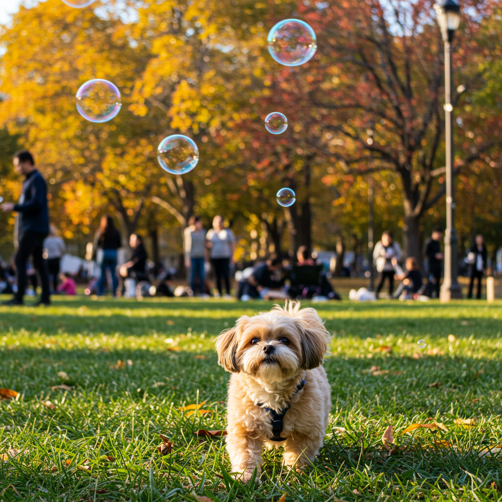 Capture a heartwarming scene in a sunlit city park where a playful Shih Tzu Chihuahua mix, with its distinctive fluffy coat and bright, curious eyes, is joyfully chasing bubbles floating through the air. Nearby, a gentle autumn breeze rustles the vibrant golden and crimson leaves on the trees, and a diverse crowd of people picnic, play, and bask in the warmth of the afternoon sun, creating a lively and colorful tapestry of life that celebrates the simple joys of a beautiful day.