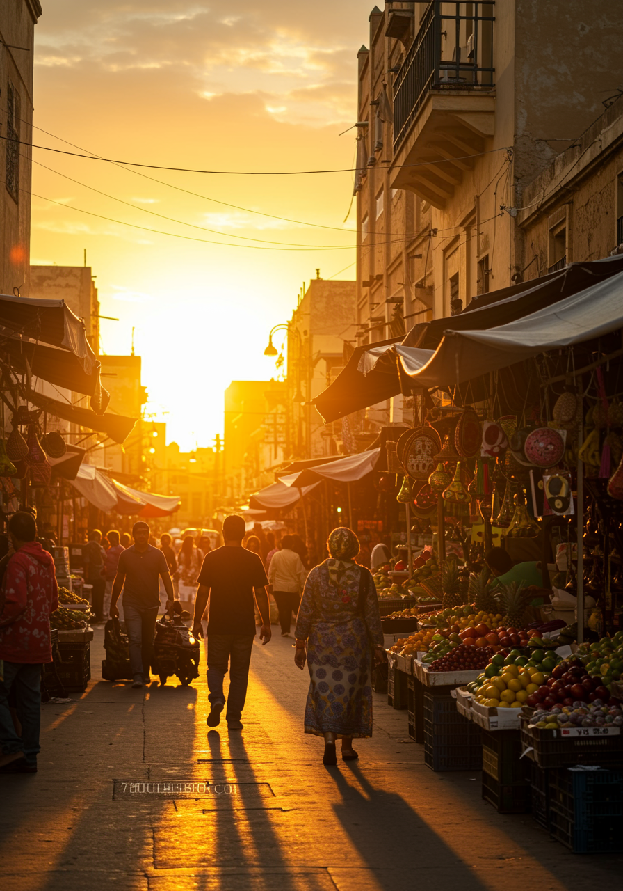 Capture a vibrant street scene bathed in the golden hues of a setting sun, where a bustling marketplace comes alive with colorful stalls selling an array of exotic fruits, handmade crafts, and aromatic spices; the image should convey the essence of life in motion, symbolizing the endless possibilities available, much like the opportunities unlocked with a "Shutterstock free trial."