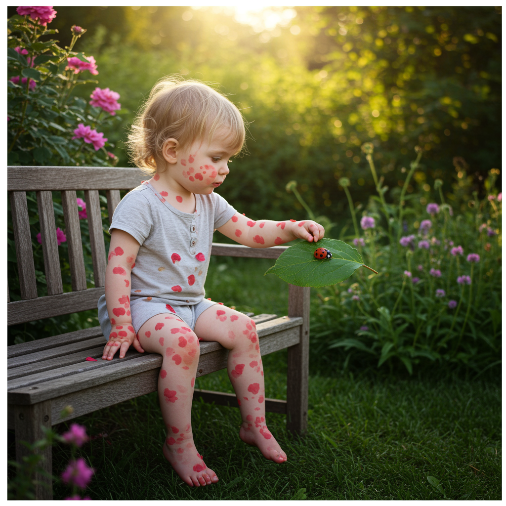 Capture a serene garden scene bathed in golden afternoon light, where a child sits on a rustic wooden bench with a curious expression, arms and legs spotted with small, red, petal-like marks resembling a mysterious rash that contrasts vividly against the lush greenery and blooming flowers; the child's gaze focused intently on a ladybug crawling over a leaf, symbolizing both innocence and the small mysteries of life.