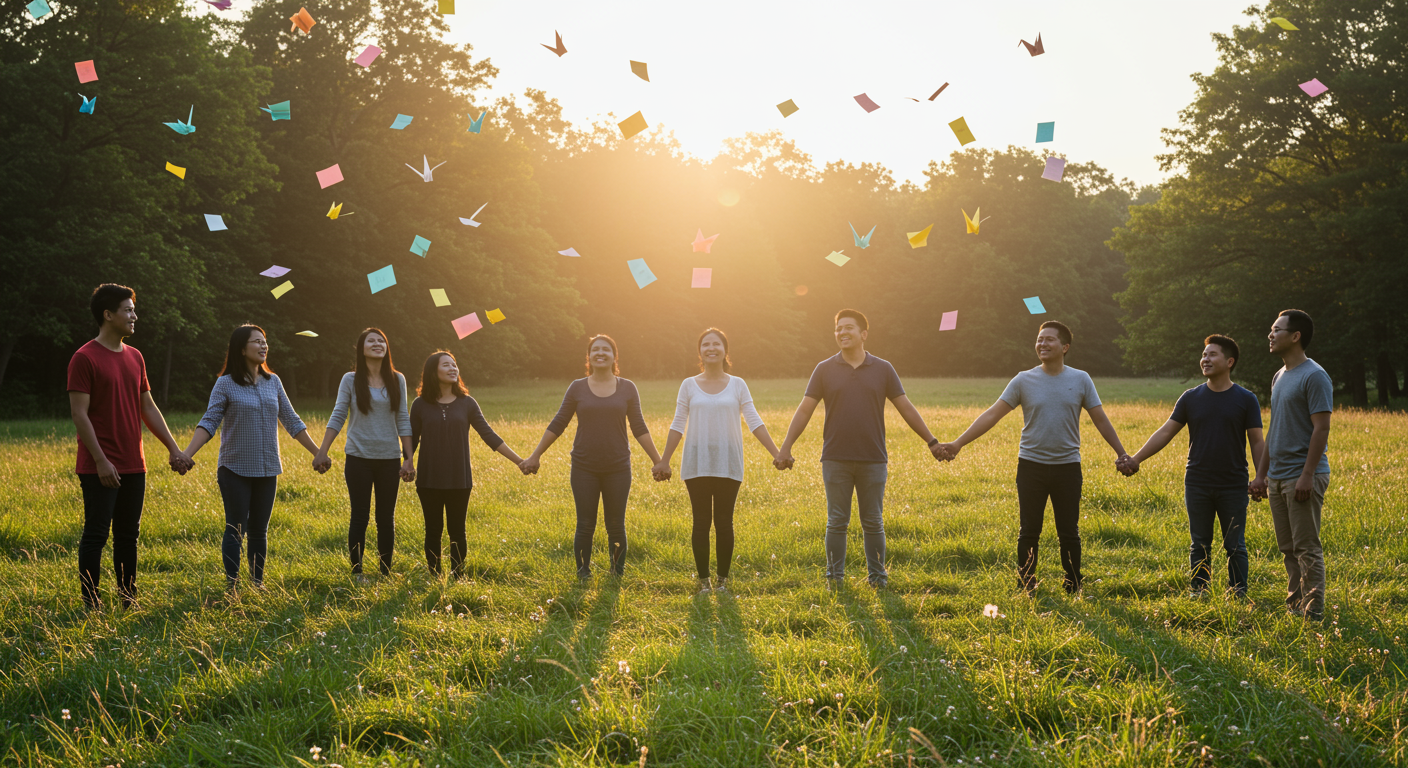 A sun-drenched meadow at dawn where diverse people stand in a circle, holding hands with genuine smiles, surrounded by floating thank you notes made from origami paper cranes; the gentle breeze carries the notes through the air, creating a sense of gratitude and unity amidst nature's tranquil beauty.