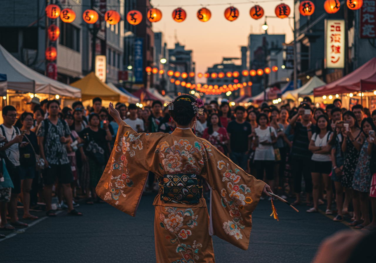 A vibrant street festival in a bustling Asian city where a diverse crowd gathers to celebrate culture and community. The air is filled with laughter and the aroma of delicious street food. Towering above the crowd, lanterns float like colorful jewels in the twilight sky. In the foreground, a dancer in a flowing, thick silk kimono adorned with intricate embroidery performs gracefully, capturing the essence of tradition amidst modernity. The scene is alive with vivid colors and intricate details, embodying the richness and diversity of Asian culture.