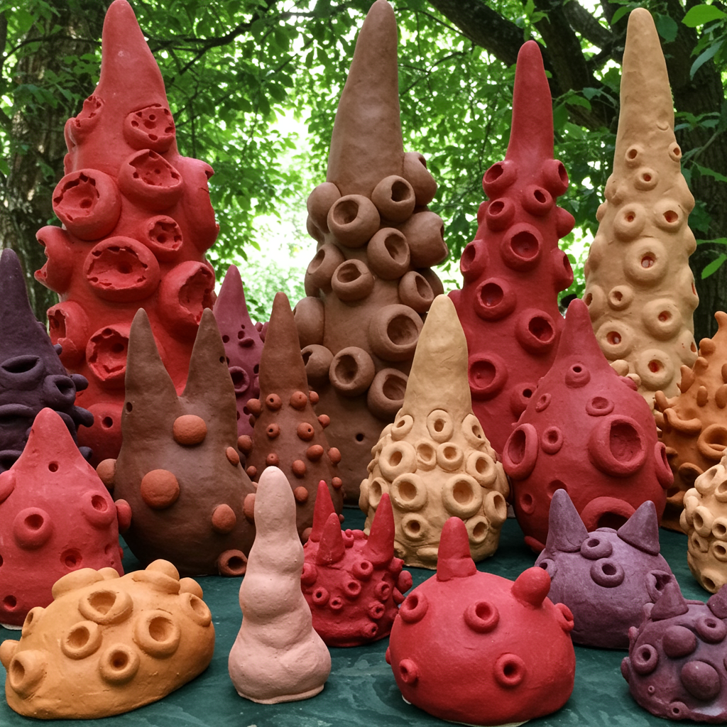Capture an image of a diverse assembly of clay sculptures, each one meticulously crafted to symbolize different types of warts, set against a backdrop resembling a whimsical, enchanted forest. The sculptures, mirroring the textures and forms of actual warts, are artistically exaggerated and vibrantly colored, portraying a surreal, almost mythical gathering. The play of light and shadow through the tree leaves above casts intricate patterns on the sculptures, adding depth and mystery to the scene while evoking a sense of curiosity and wonder about the natural world's hidden intricacies.