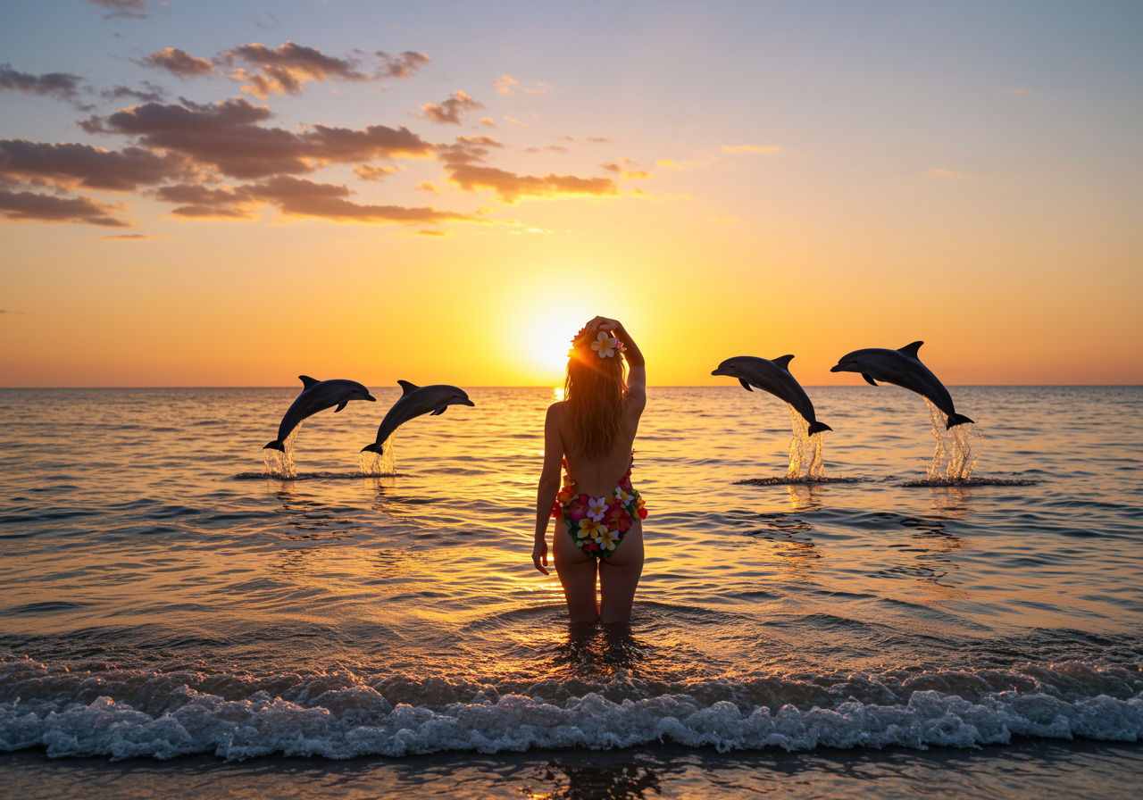 A serene summer beachscape where the sun sets in a kaleidoscope of colors, casting golden hues over the ocean; a woman in a creatively designed swimsuit made entirely of vibrant tropical flowers without a top, standing waist-deep in the gently lapping waves, surrounded by playful dolphins leaping through the surf, perfectly capturing the essence of freedom, nature, and tranquil beauty in a single moment.