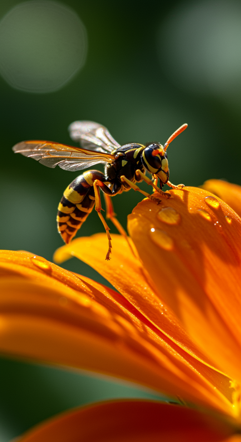 A dynamic close-up shot capturing the tense moment just before a wasp's sting makes contact with a vibrant orange and yellow flower petal, sunlight filtering through translucent wings, casting intricate patterns of shadow and light, with tiny dewdrops on the petal reflecting the drama of nature at play, surrounded by a blurred bokeh background of lush greenery, conveying both the beauty and danger inherent in even the smallest details of life.