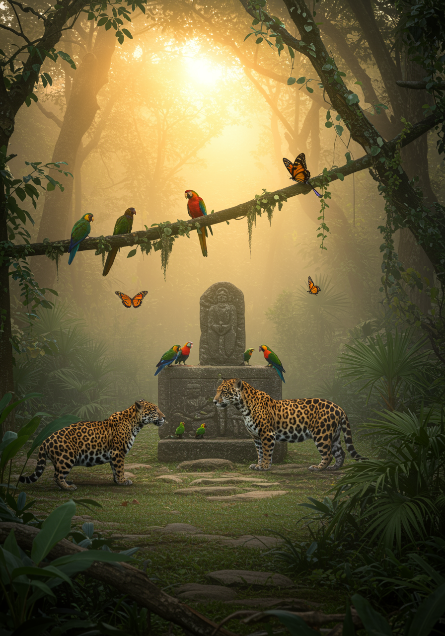 A serene golden sunrise filters through the mist in a lush, untouched rainforest, casting ethereal light on a small clearing where a family of vibrant, multicolored parrots gather around an ancient stone altar. Nearby, a curious young jaguar, its sleek fur dappled with the sun's rays, stealthily observes the scene from a vine-draped branch, while a pair of majestic tropical butterflies drift lazily in the air, adding a whimsical touch to this harmonious glimpse of unspoiled wildlife.