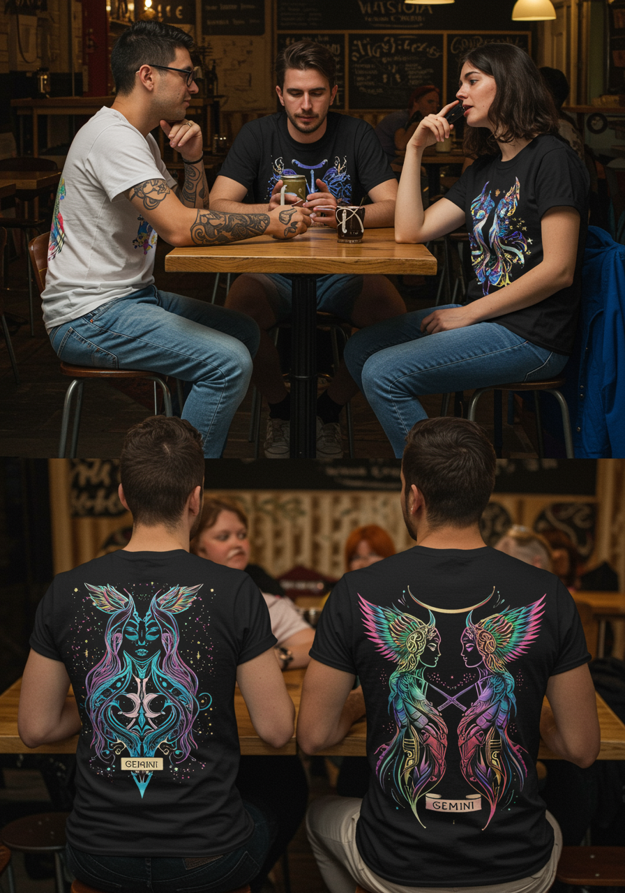A vibrant scene in a trendy urban café where individuals of all backgrounds gather, each wearing artistically designed t-shirts featuring intricate "Gemini tattoos" motifs. The t-shirts display dual themes, blending celestial twins with mirrored designs and mythical symbols. The fabric of each shirt tells a story through vivid, kaleidoscopic colors that emulate the dynamic personality and dual nature of Gemini. Imagine a range of styles from abstract line art to watercolor illustrations, reflecting both unity and contrast, symbolizing the multifaceted nature of Gemini. The image captures the uniqueness of personal expression as displayed through these wearable art pieces, epitomizing the fusion of fashion and astrology.