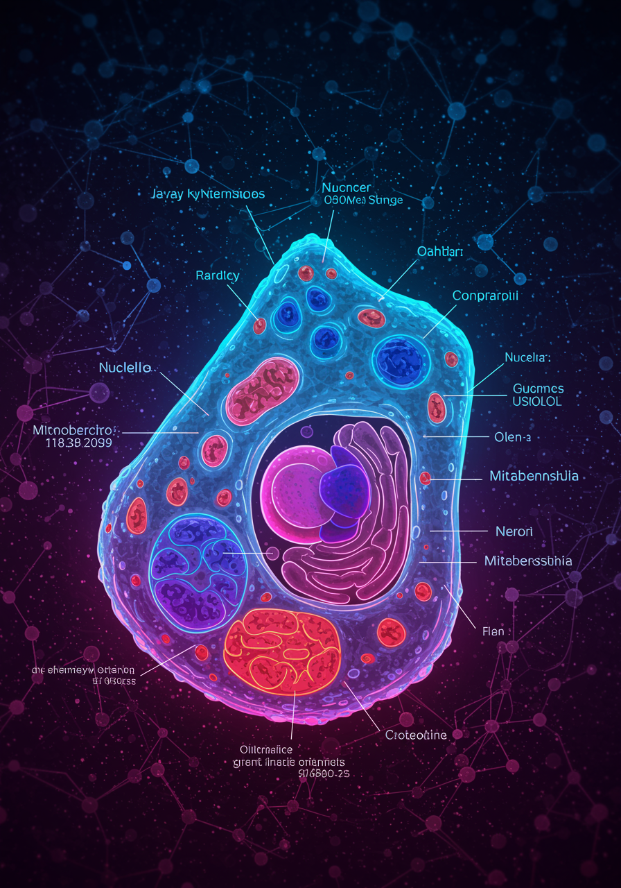 Imagine a futuristic, neon-lighted microcosm where vibrant, luminous vectors swirl gracefully around a central, intricate sphere—an animal cell diagram brought to life in a surreal digital art style. Each component of the cell, from the vibrant nucleus to the shimmering mitochondria, glows with vivid colors and is labeled in a stylish, high-tech font that seems to hover elegantly in the air. The background is a mesmerizing tapestry of interconnected digital svgs, their paths and nodes resembling a cosmic dance, accentuating the wonder and complexity of cellular anatomy. This ethereal scene is both a scientific exploration and an artistic journey into the heart of microscopic enigma.