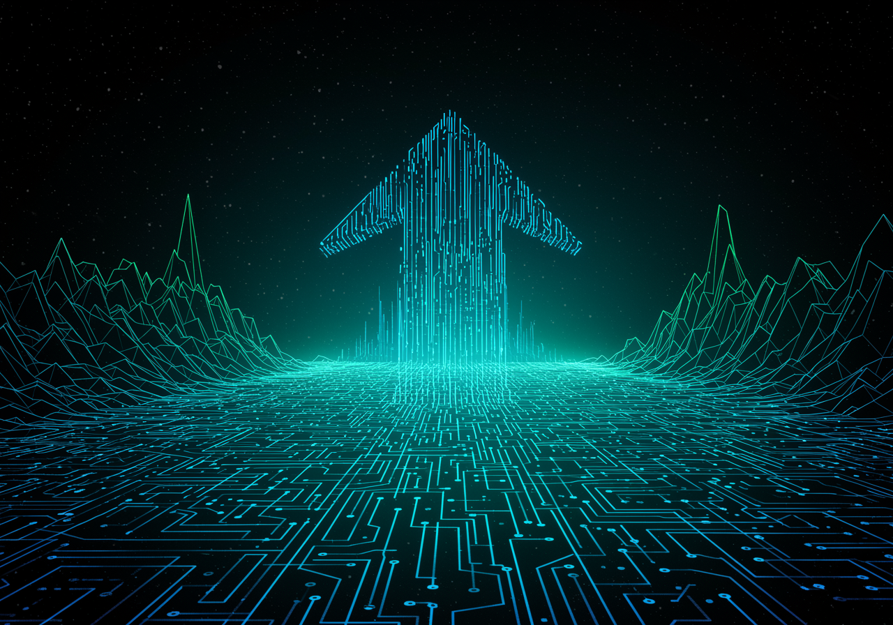 Create an intricate digital artwork where abstract vectors interweave to form a mesmerizing tapestry reminiscent of a cosmic skyline. At the center of this composition, a large, stylized arrow made from myriad individual vector lines points upwards, symbolizing momentum and aspiration. The canvas is filled with vibrant shades of electric blues and neon greens, accentuating the arrow's journey through an ever-evolving landscape of geometric patterns. This arrow image stands as a futuristic beacon, embodying the fusion of technology and imagination as it transcends dimensional boundaries.