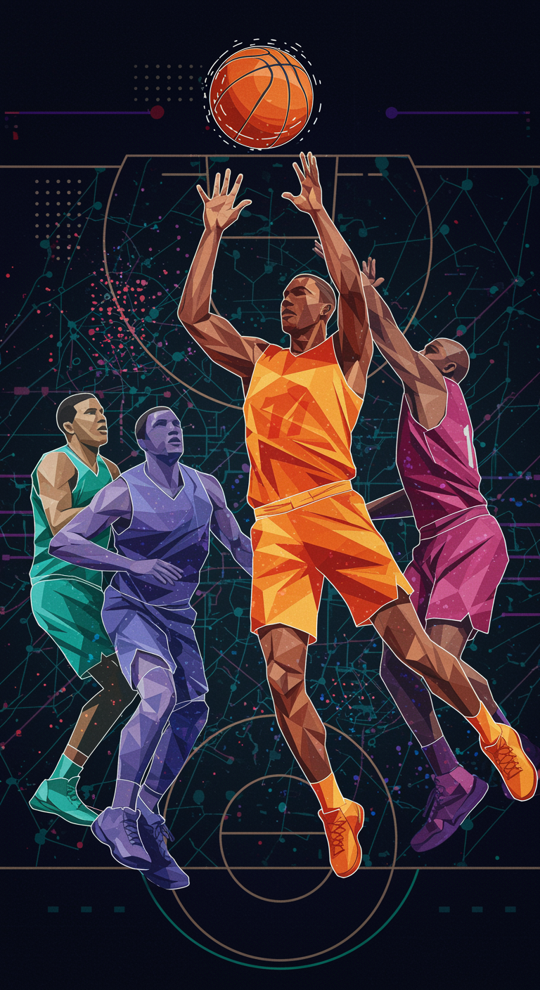 Imagine a vibrant SVG illustration where geometric shapes and bold lines converge to form an abstract basketball game—a dynamic scene where the players are composed of intricate, interlocking vectors with transparent layers that shift in opacity. The basketball itself is a swirling orb of hexagonal patterns, casting shadows that morph into the shapes of cheering fans. The court is a network of interconnected lines resembling a digital circuit board, with colorful bursts like data points capturing the energy and motion of the players.