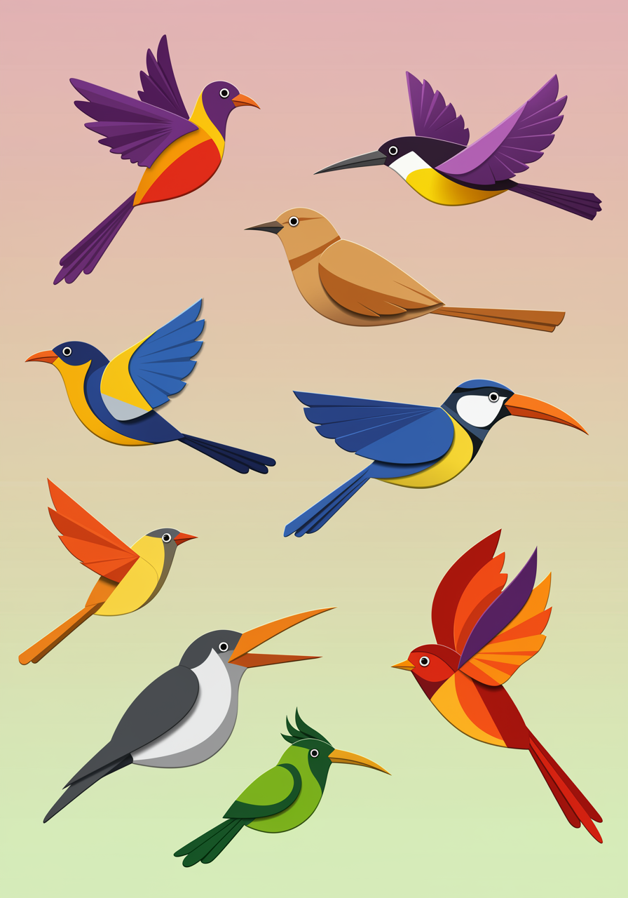 Envision a whimsical collage of vibrant bird clipart, each bird represented as sleek, abstract vectors, akin to digital origami. Their stylized forms are composed of bold geometric shapes in vivid colors, seamlessly flowing into each other like a kaleidoscope. The birds, varying in species, exhibit exaggerated, playful features, such as elongated beaks and exaggerated wings, all outlined with clean, minimalist lines in SVG style. Each bird appears suspended in motion against a soft, gradient sky, creating a sense of harmony and artistic balance, inviting viewers to explore the intersection of nature and digital art.