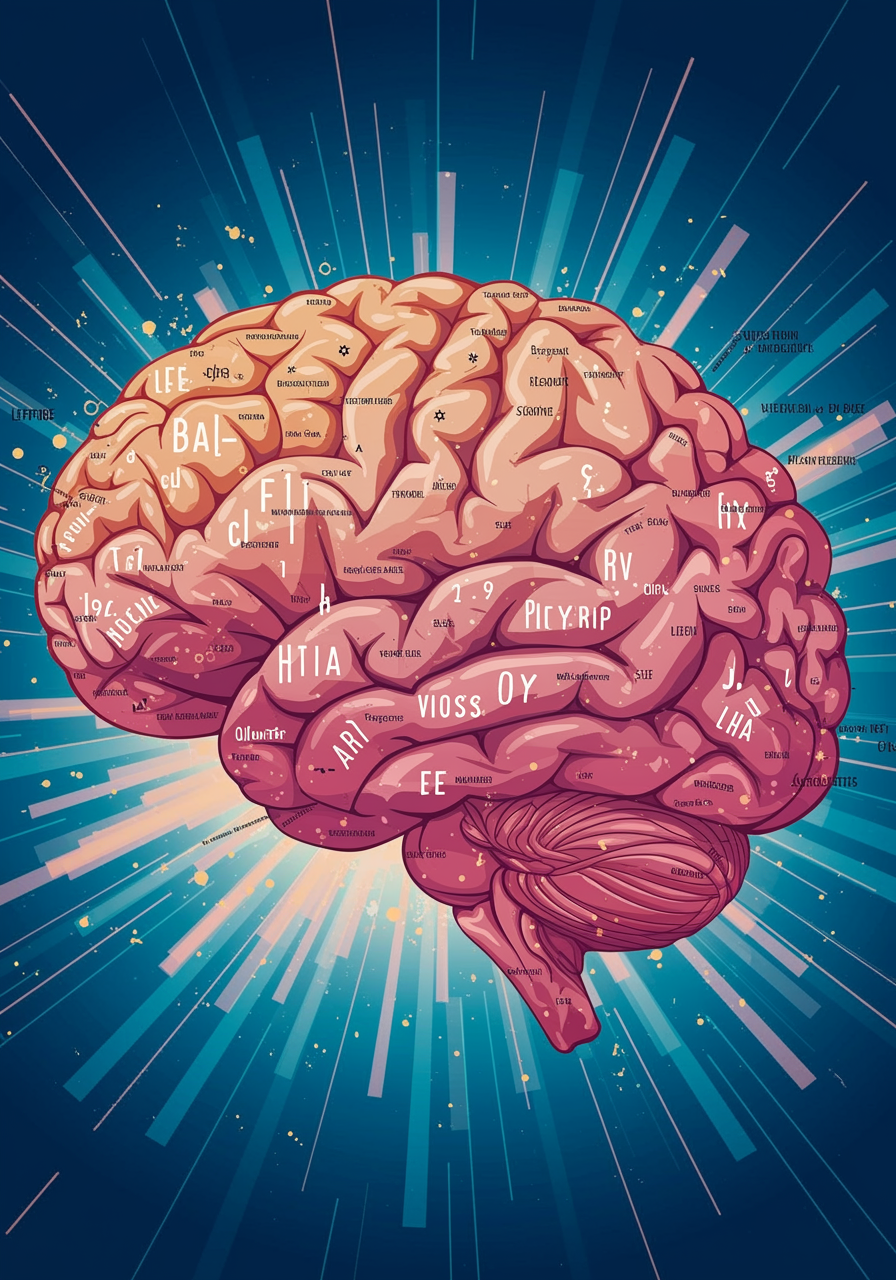 A surreal illustration showcases a vibrant and intricate brain diagram, composed entirely of colorful vectors and SVG-inspired shapes. Each region of the brain is meticulously labeled with elegant, flowing typography, seamlessly blending art with science. The image bursts with geometric patterns and abstract designs, symbolizing the complexity and interconnectedness of neural pathways. Radiating lines and dynamic vector elements dance around the diagram, evoking a sense of movement and intelligence. This fusion of artistic expression and scientific precision invites viewers into a captivating exploration of the mind’s architecture in a modern, digital aesthetic.