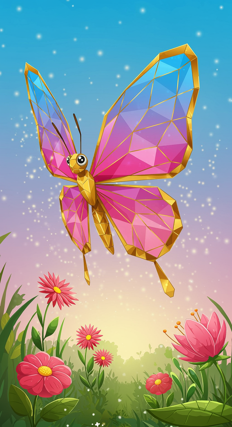 Imagine a whimsical scene where a colorful butterfly cartoon comes to life, its wings made from vivid, geometrically perfect SVG vectors that shimmer with gradient hues of blue, pink, and gold. Each segment of its wings is composed of intricate, interlocking geometric shapes—hexagons, triangles, and circles—that fit together in a mosaic of creativity. The butterfly flutters through an enchanting digital garden, where every flower and leaf is also crafted from detailed vector art, blending nature with artful precision. The scene captures the joyous dance of technology and nature, with the butterfly's expressive eyes and playful antennae adding a touch of animated charm.